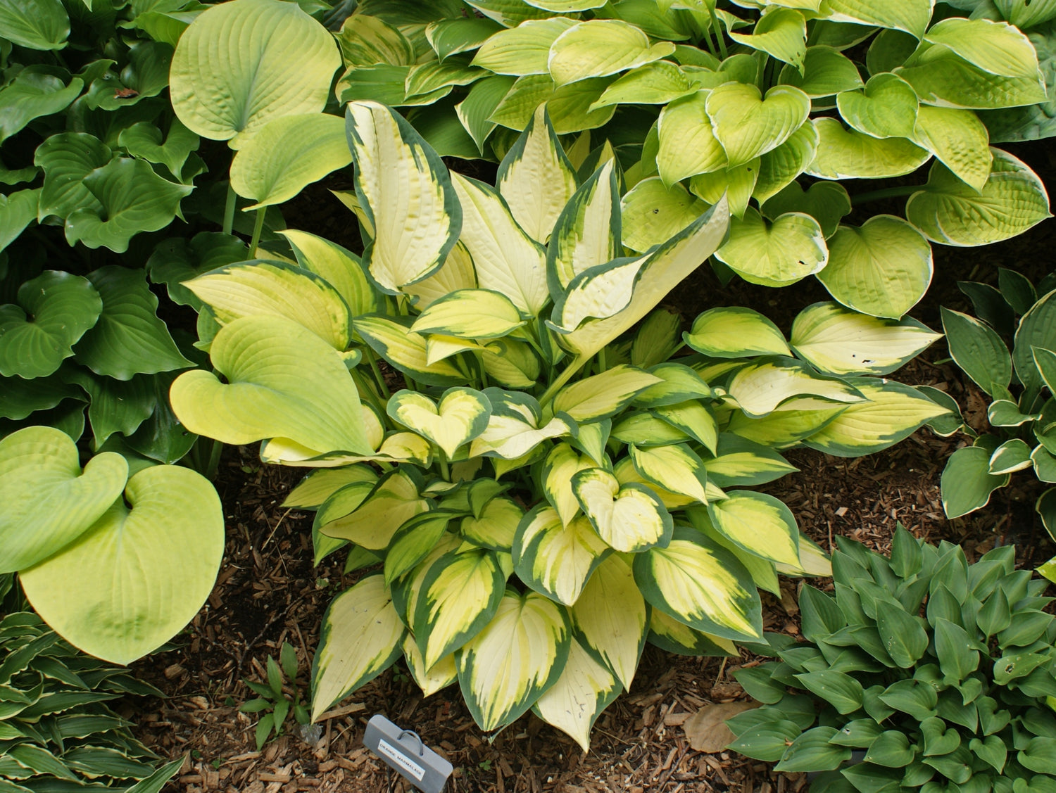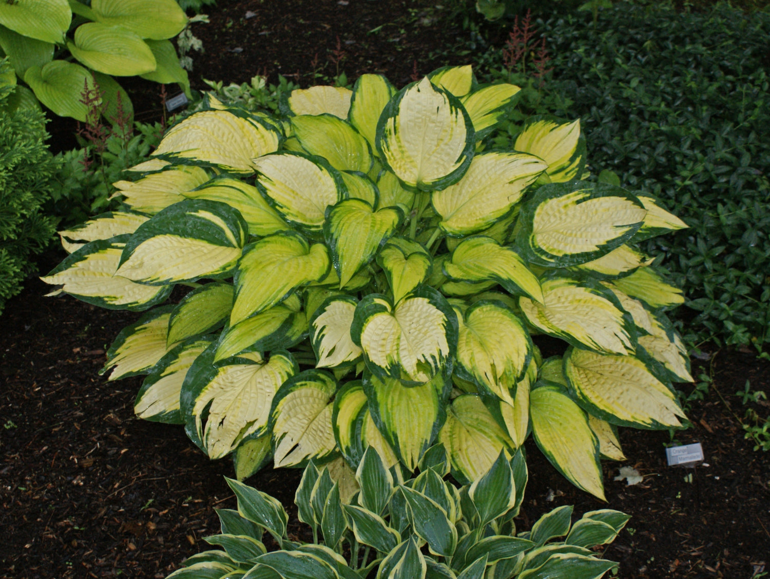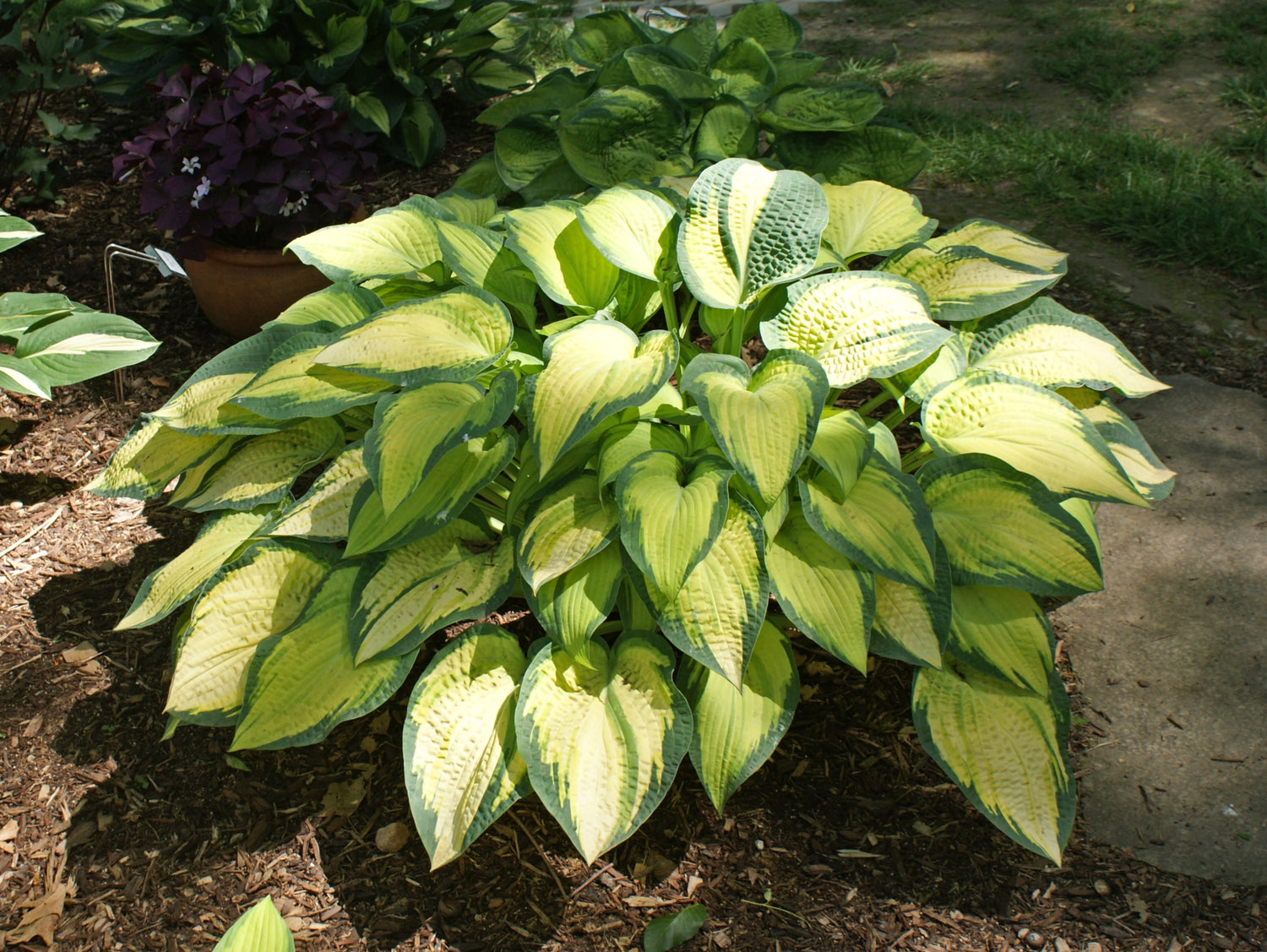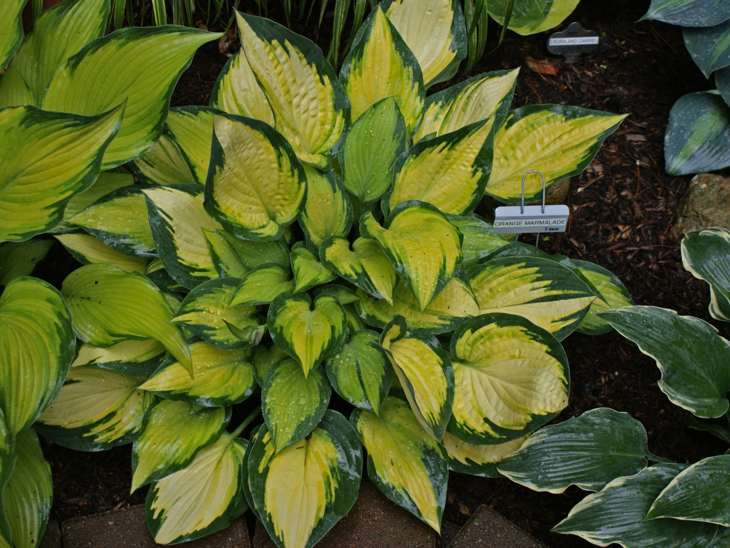 - H. 'Orange Marmalade' hosta has thin blue-green margins that contrast nicely with the gold centers.