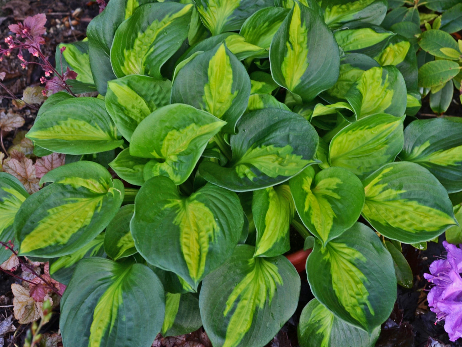 - Sport of H. 'Rainforest Sunrise' with wider dark green margins.