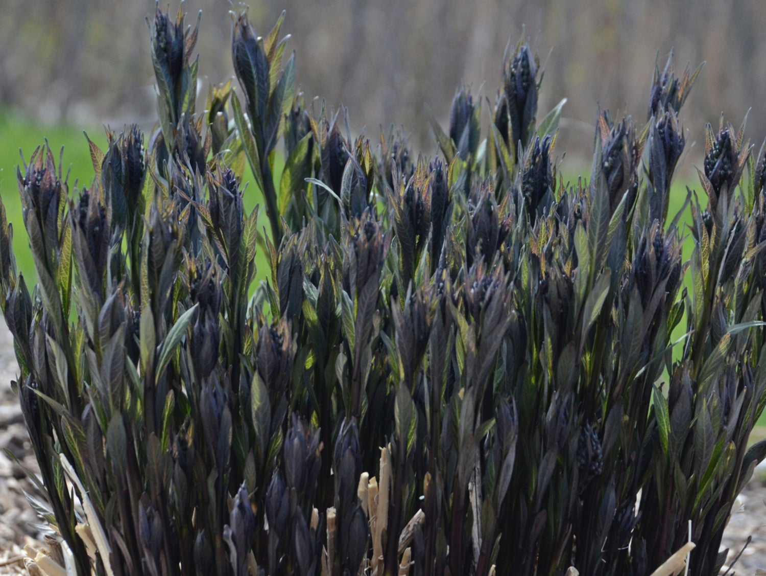 - In spring, new stems emerge near-black with leaves that are very dark green with silver veins.