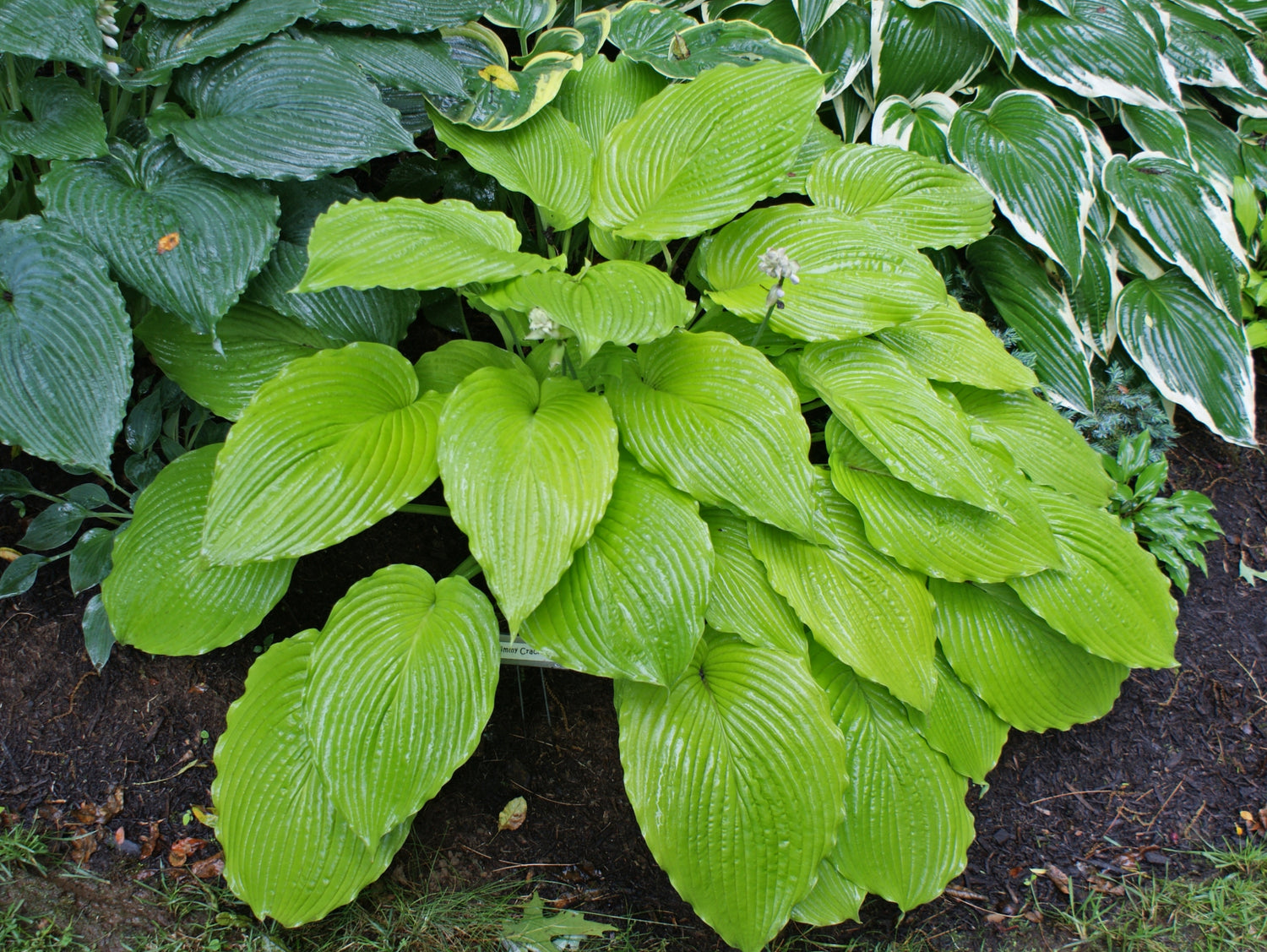 • Hosta 'Jimmy Crack Corn' Hosta has extremely wavy margins and deeply impressed veins on shiny gold leaves.