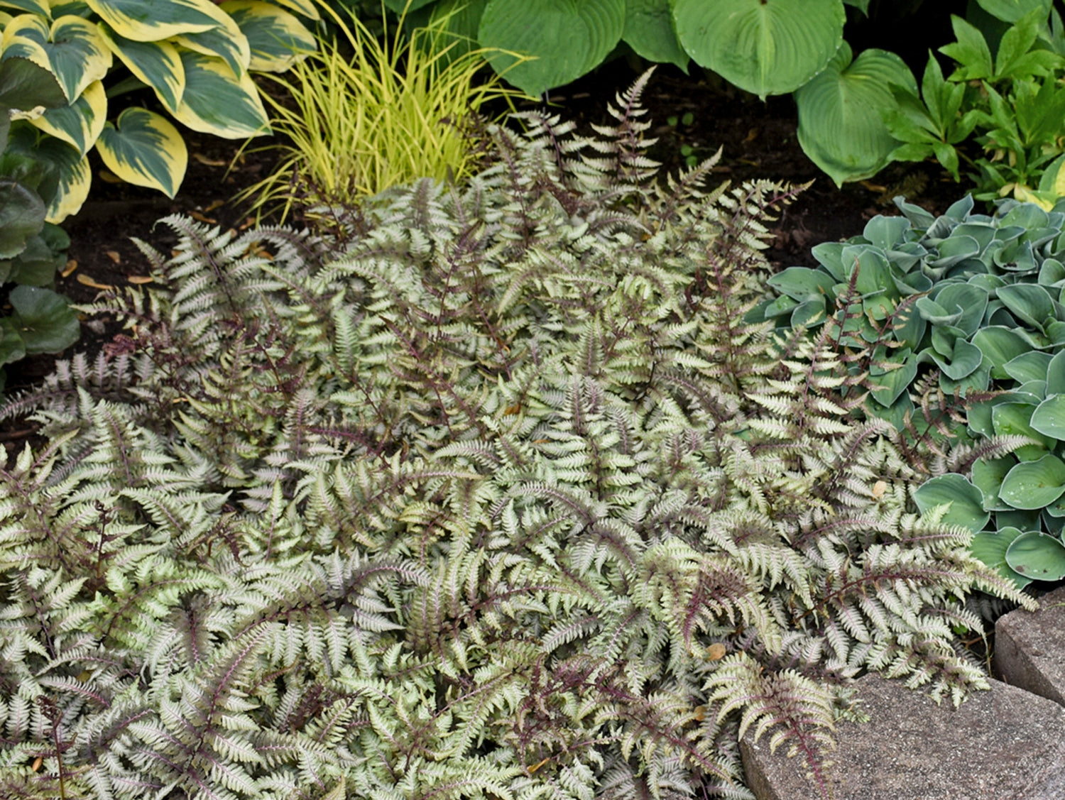 - The silver and burgundy colors of this fern contrast beautifully with all different hostas. Try mixing this fern in between some blue, green and gold hostas.