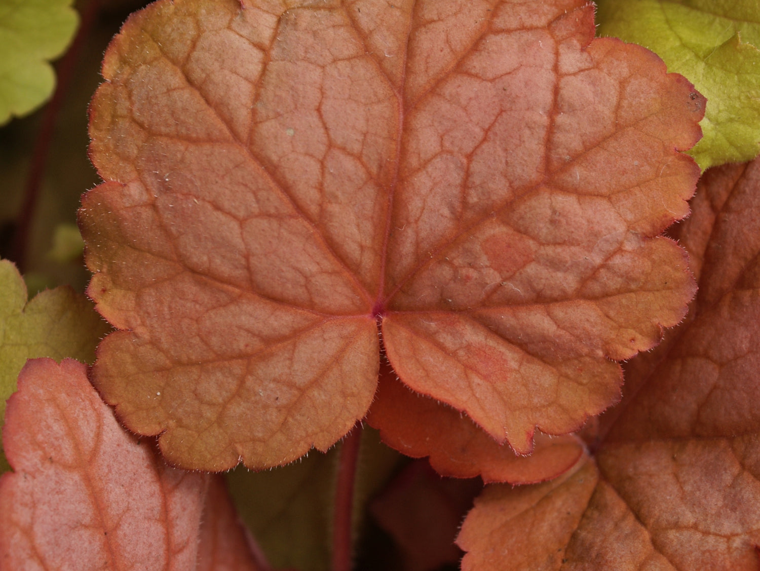 • Intensely colored Heuchera with peach leaves and a light silver overlay. Adds excellent contrast to the shade garden.