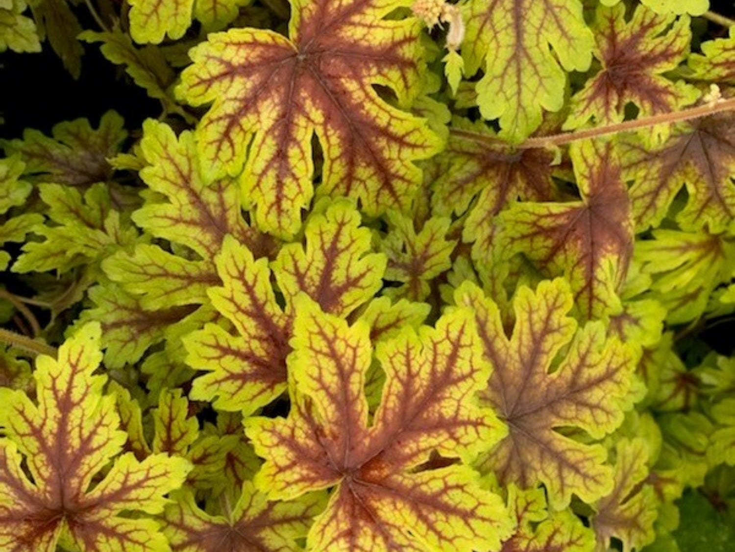 - This large-leaved variety has deeply lobed chartreuse leaves with dramatic burgundy red centers.