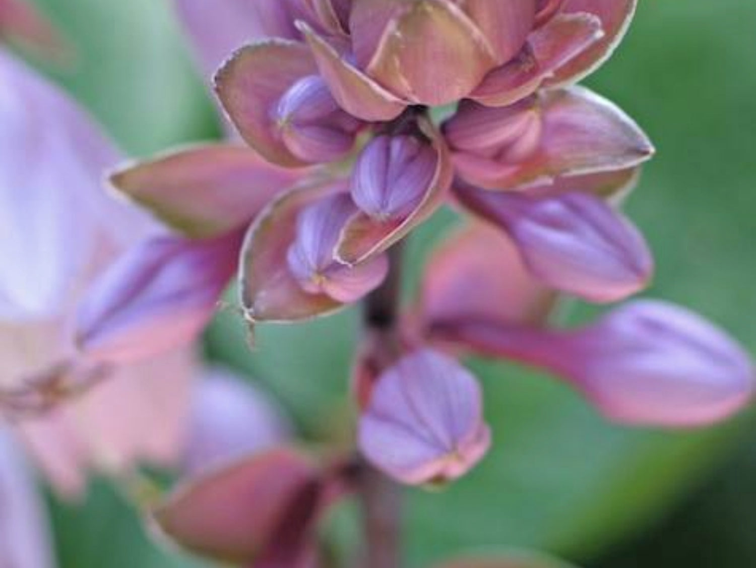 • The inflorescence leaves (leaves at the base of each flower) are medium green with a bright pink center.