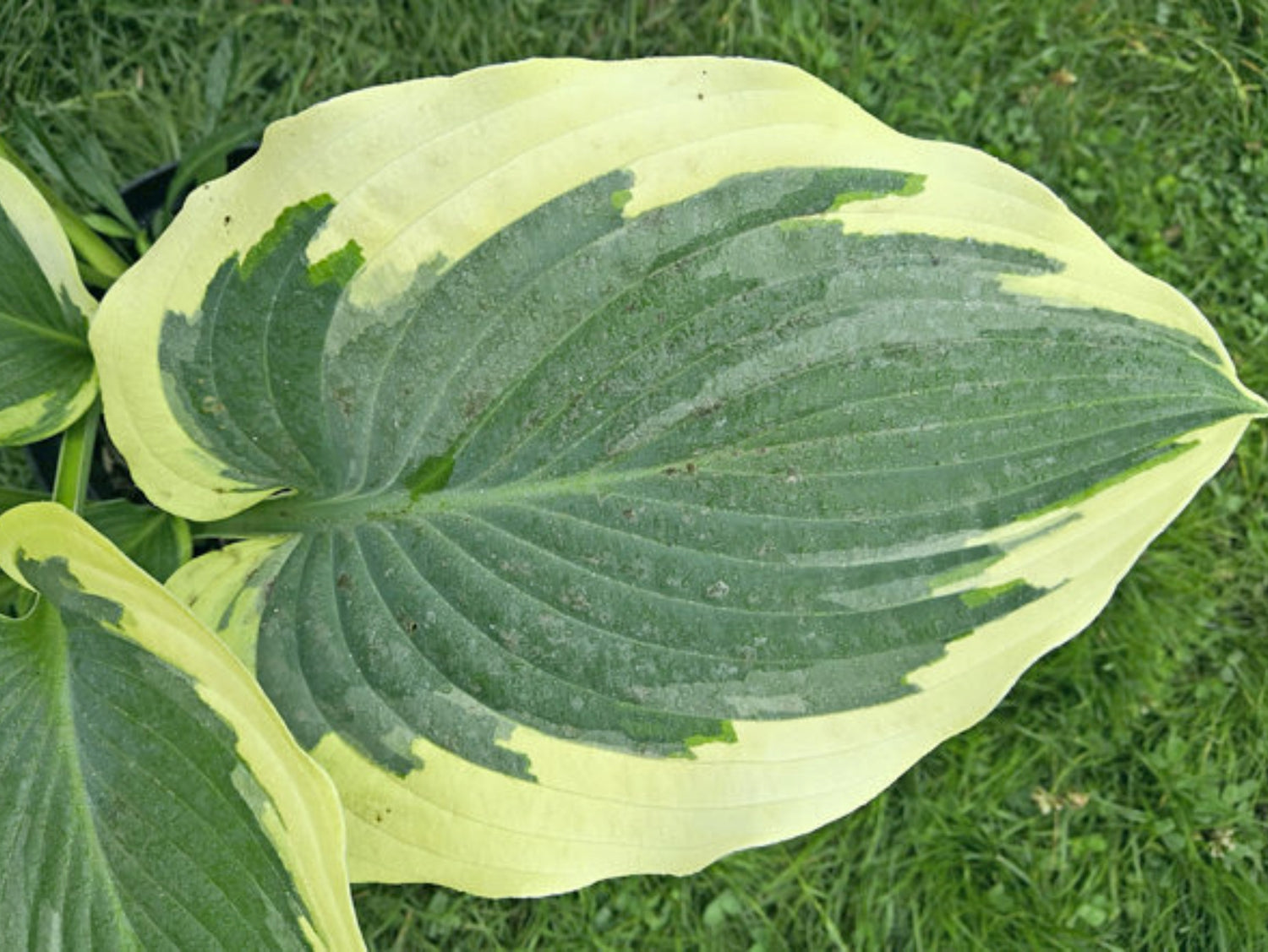 - Heart-shaped blue-green leaves with wide cream margins.
