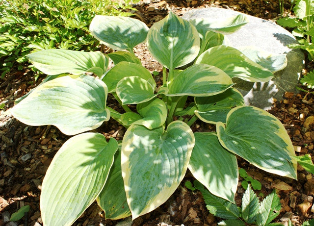 - Hosta 'Hampshire County' produces a mound of broad blue-green leaves with a wide cream margin.