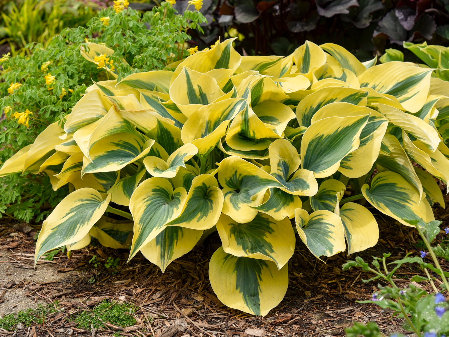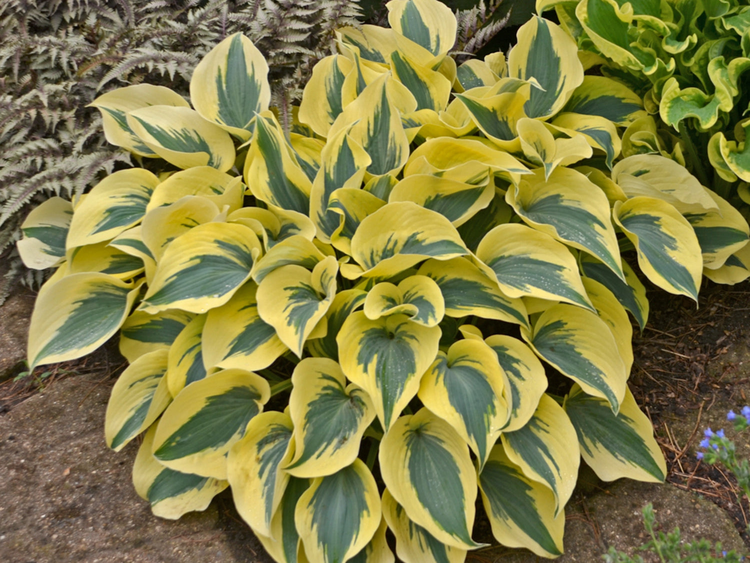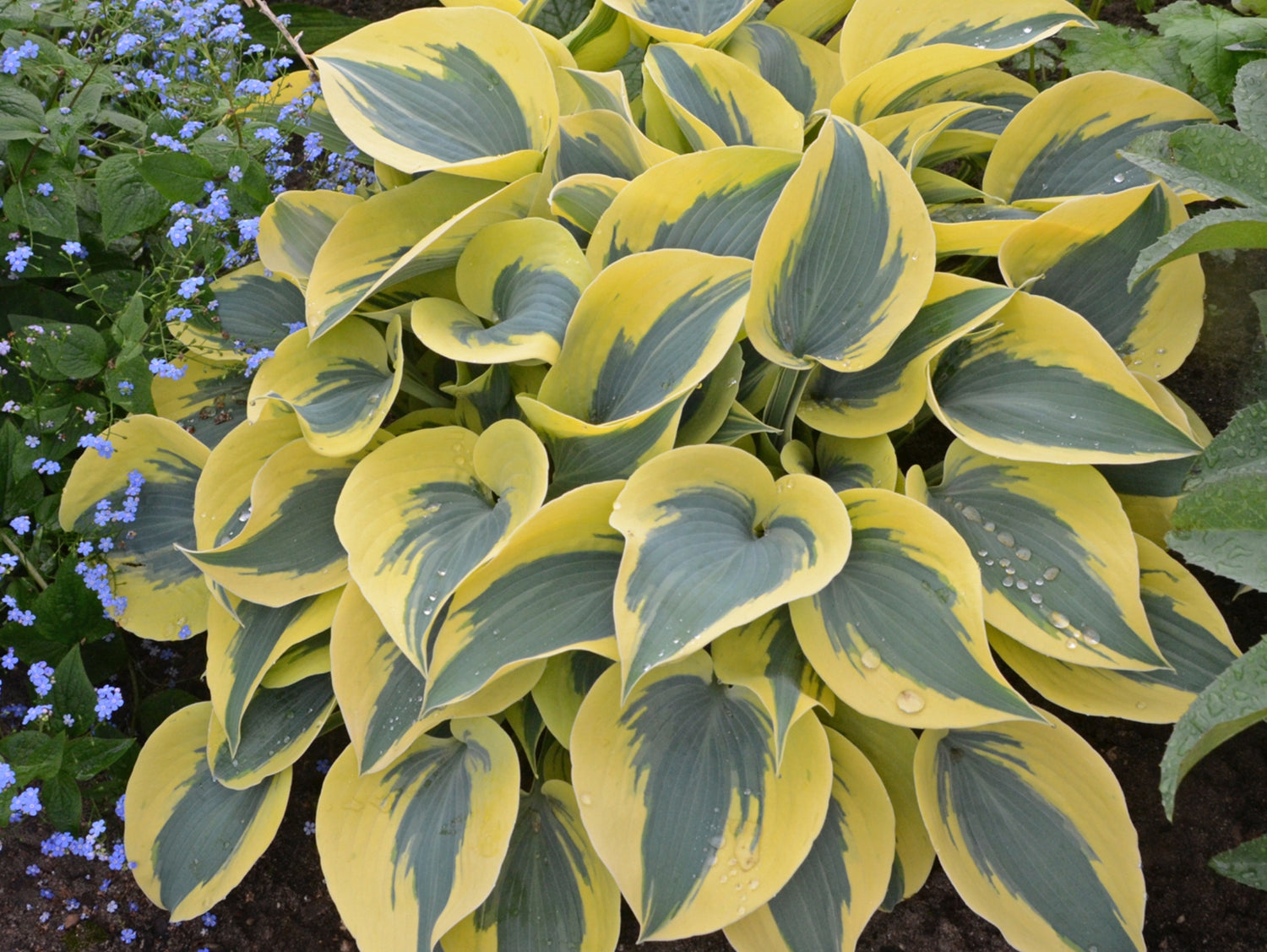 - Hosta 'Autumn Frost' emerges in spring with powder blue leaves and bright yellow margins.
