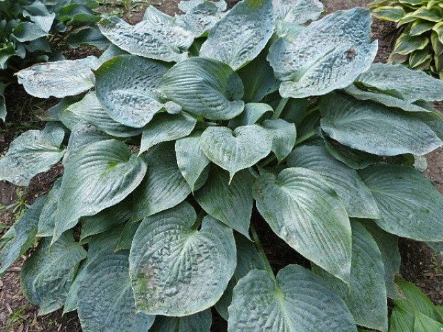 - Very nice blue hosta with a lot of glaucous bloom giving a chalky silvery-blue appearance.