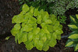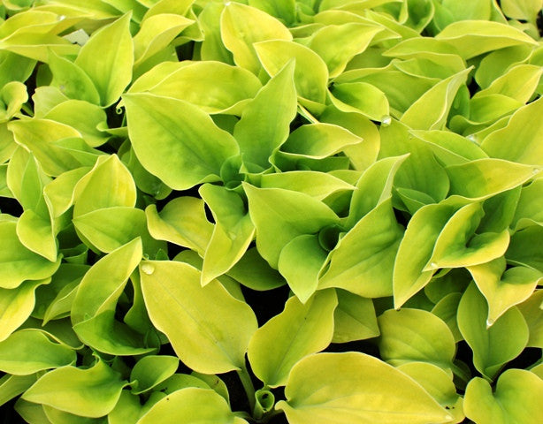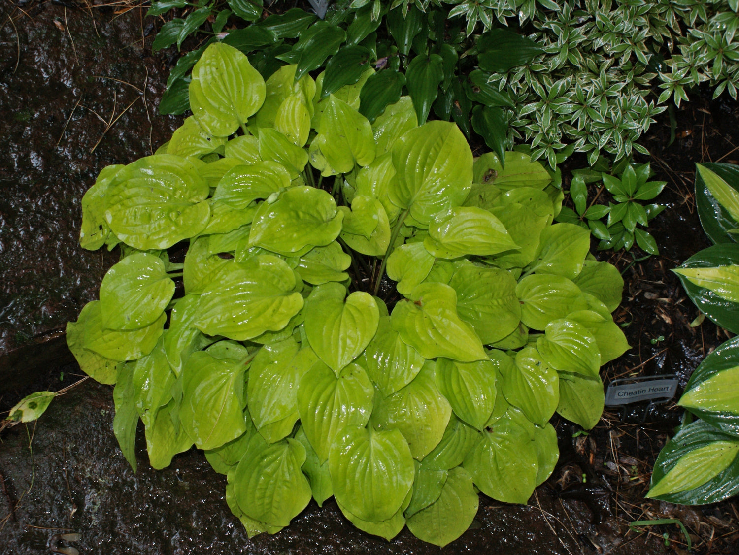 - Hosta 'Cheatin Heart' forms a nice small mound of golden oval shaped leaves that are folded and slightly wavy.