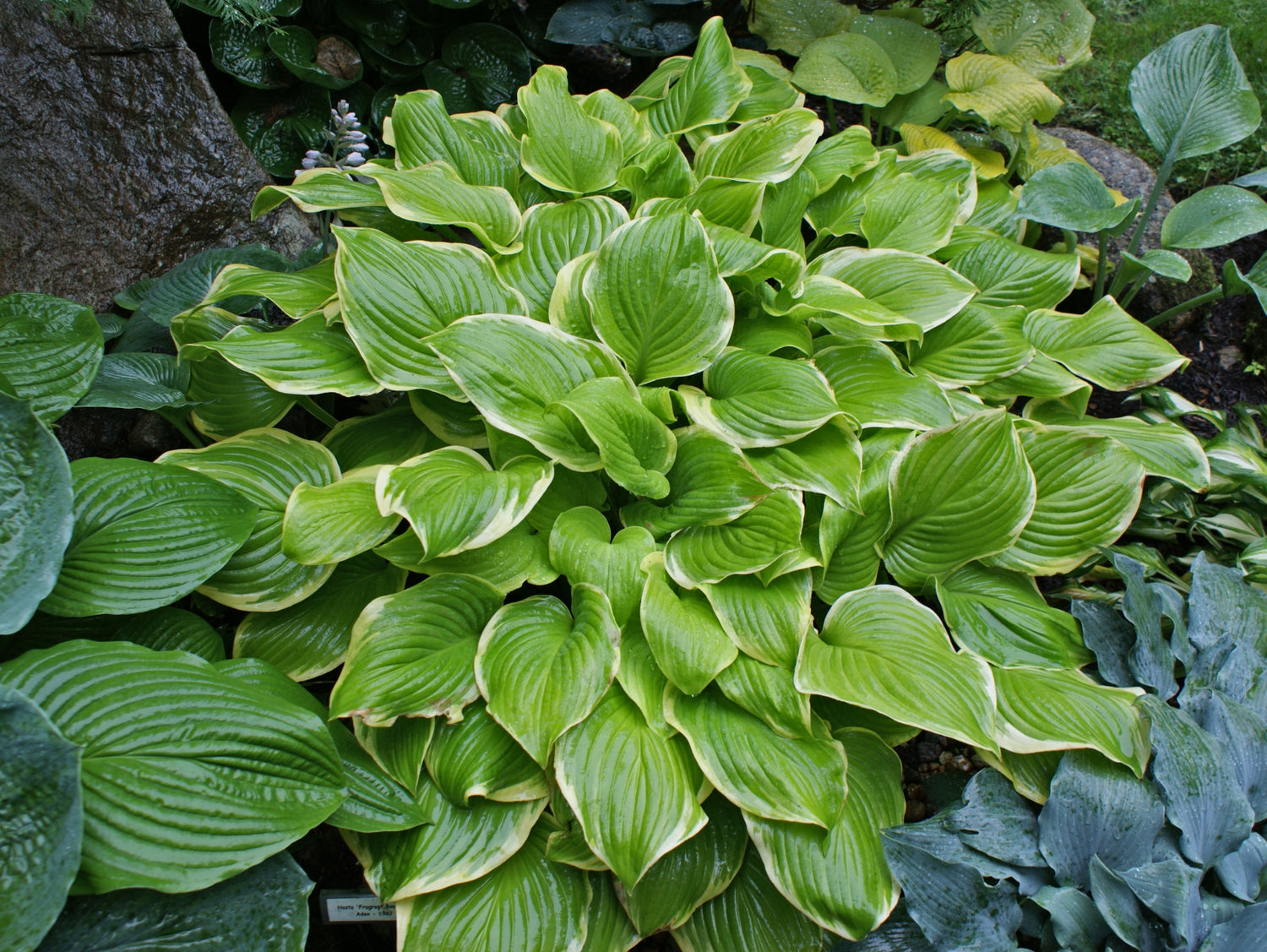 - Hosta 'Fragrant Bouquet' is an outstanding large hosta that has apple green foliage and wide cream leaf margins.