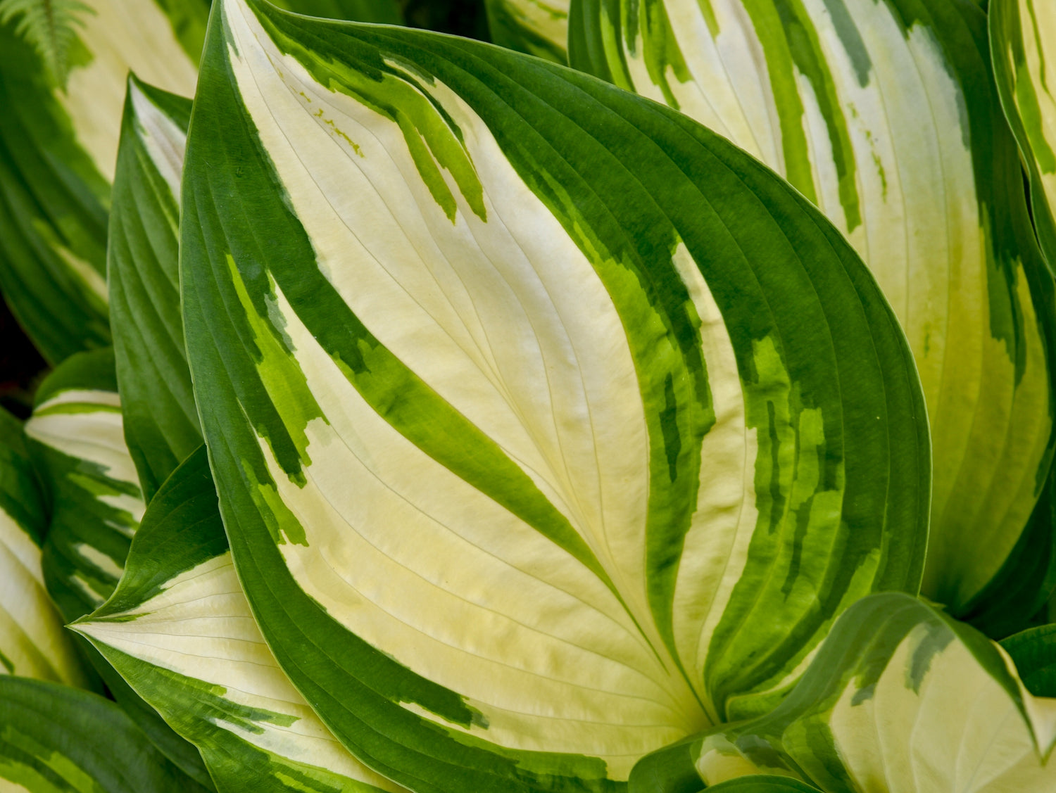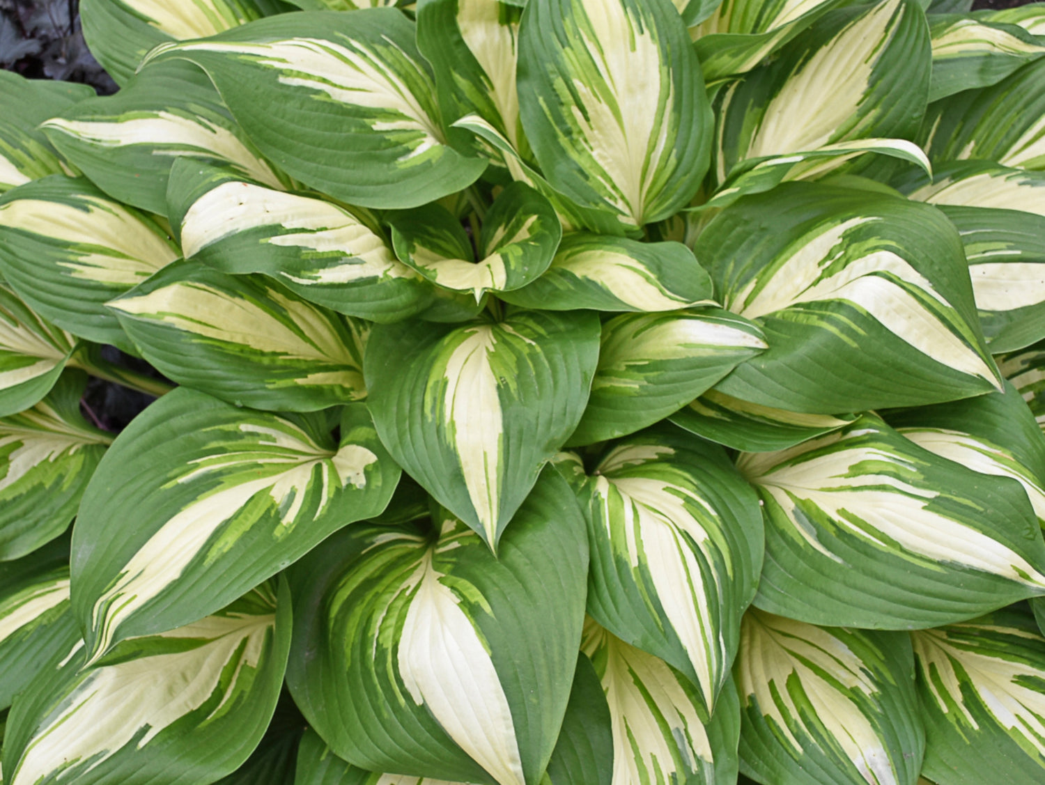 - Medium green, heart-shaped leaves have white centers and light green intermediate streaking between the center and margin.