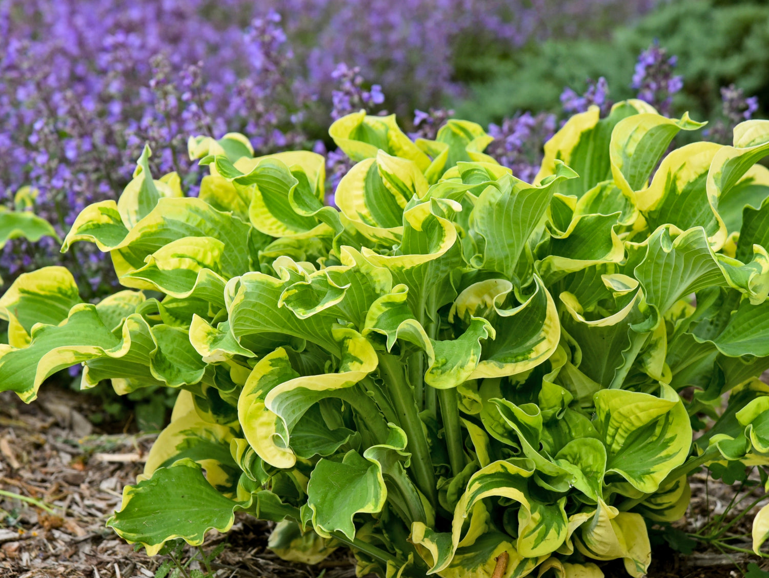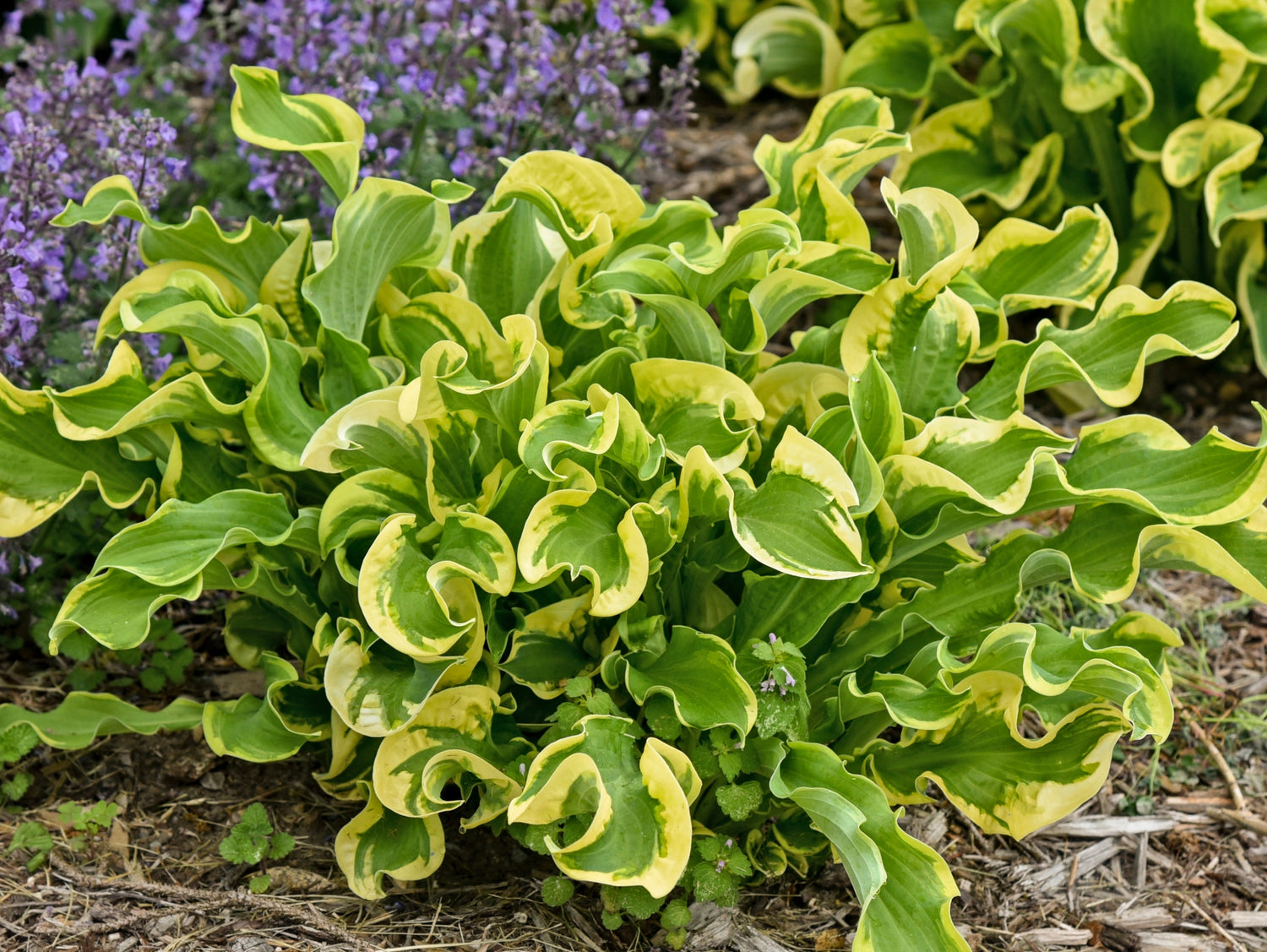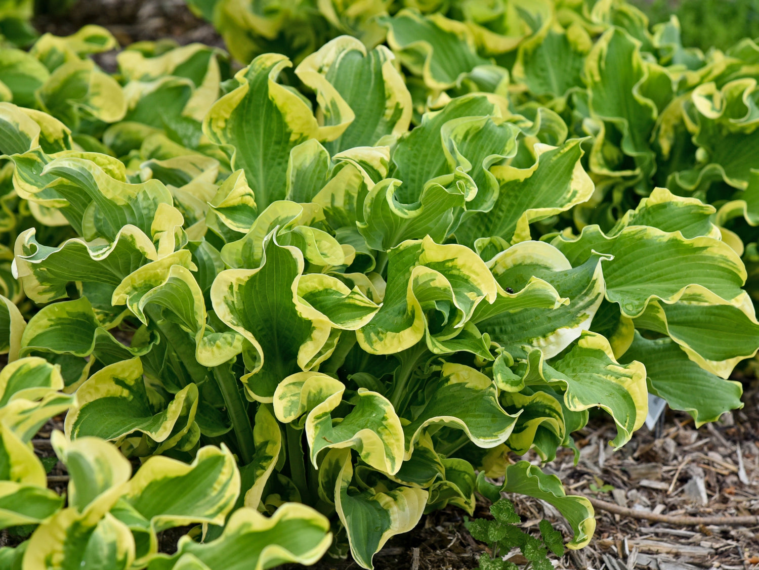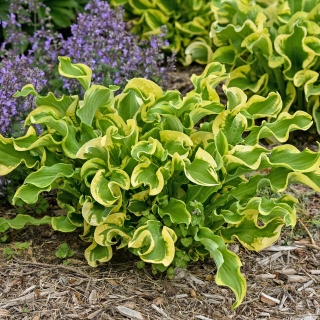 - Medium sized hosta with green leaves and an extremely ruffled yellow margin.