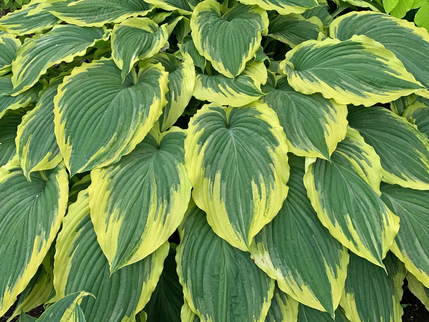 - Large, ovate leaves have green centers with brightly contrasting yellow margins.