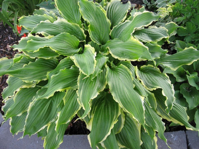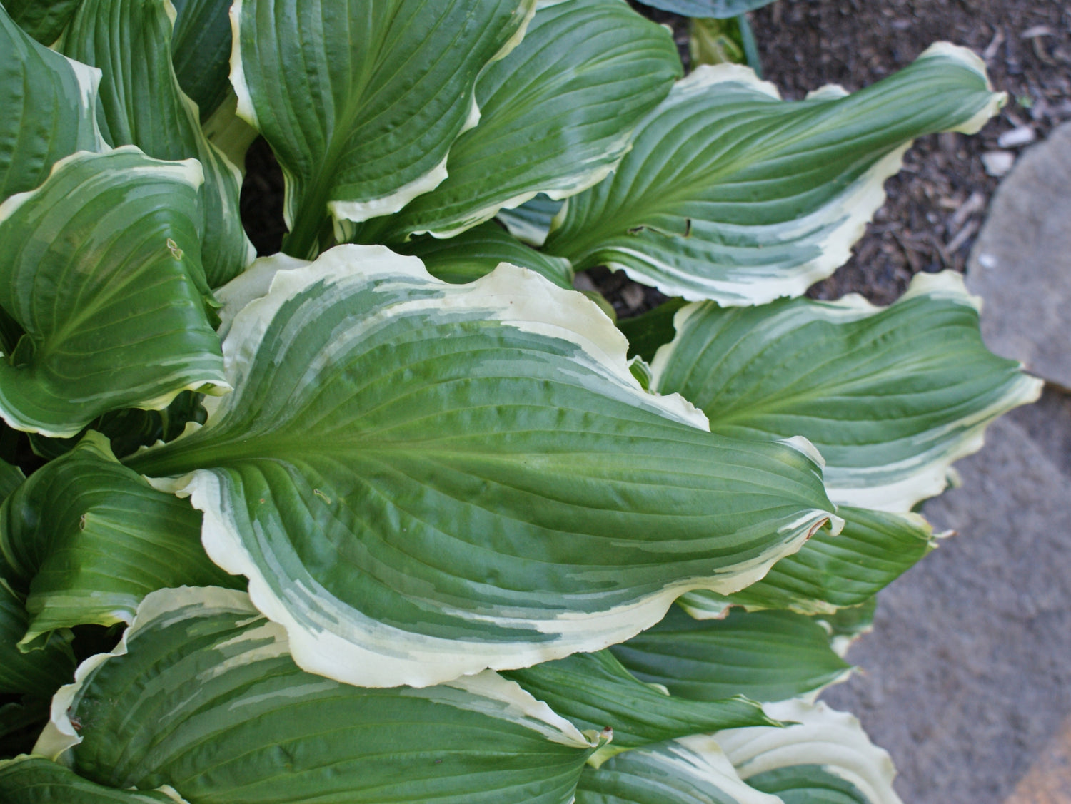 - The green leaves of 'Ginsu Knife' are bordered by a serrated cream margin.