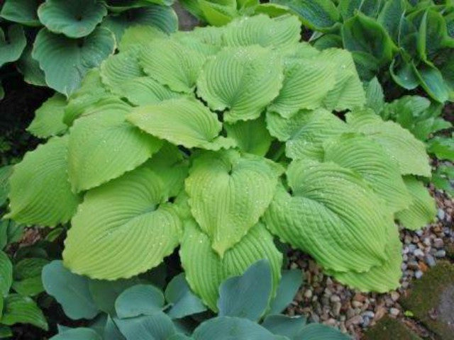 - Deeply impressed veins and some corrugation help this hosta stand out.