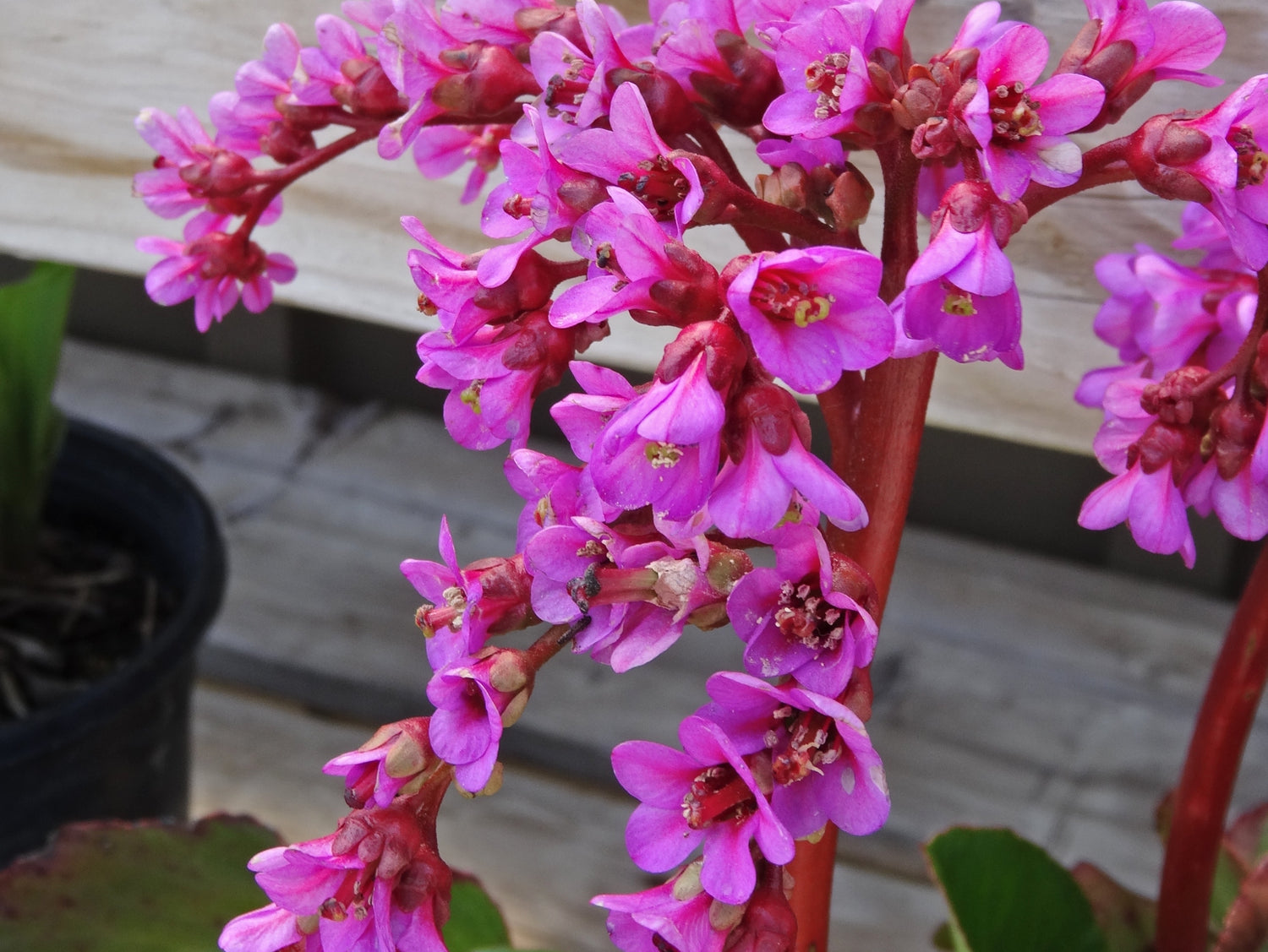 • Known as “Pigsqueak” for the squeaky sounds its leaves make when rubbed, this unique perennial features bold, glossy, dark green foliage crowned by deep purple-red blooms in early spring.