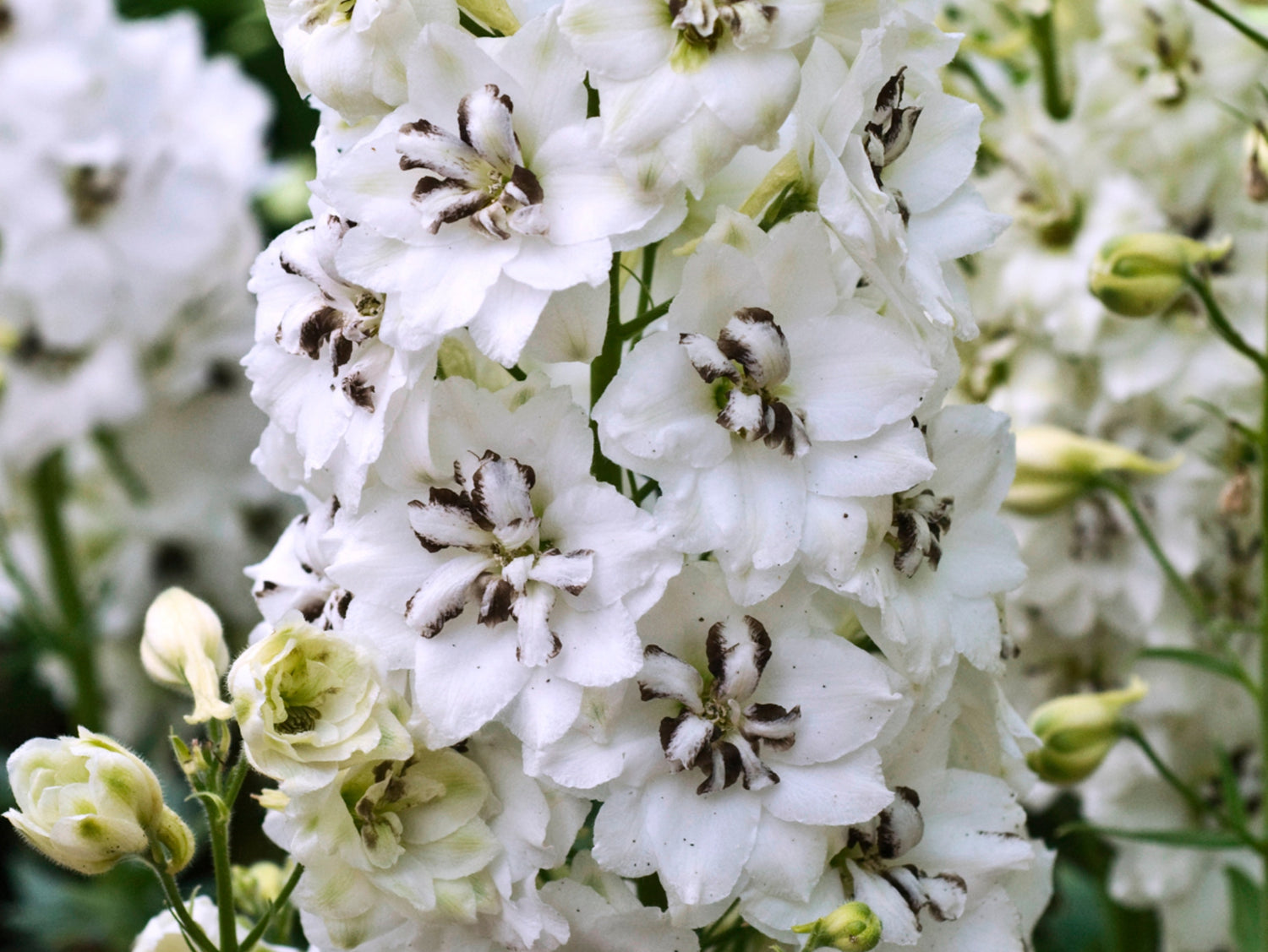 - Aptly named, this Delphinium produces tall spires of frilly white flowers with black bees.