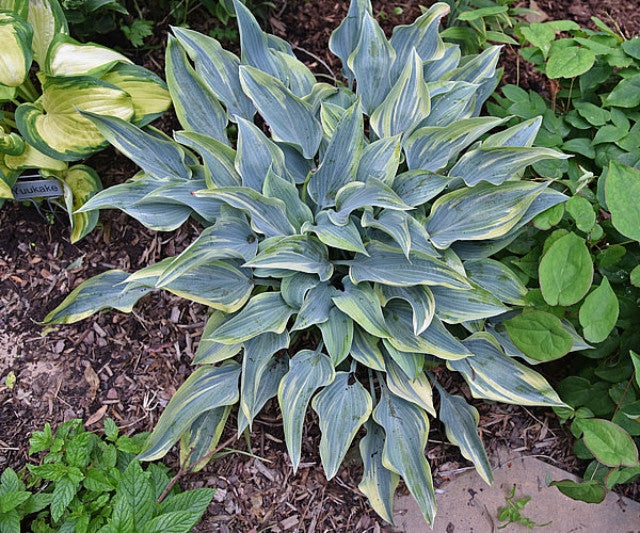 - Wavy mound of blue-green foliage with thin chartreuse margins.