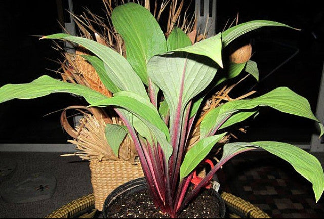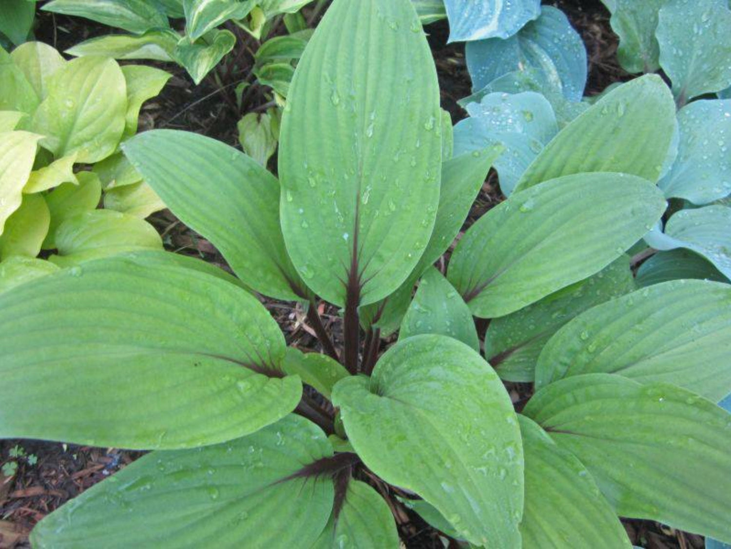 - Upright hosta with elongated green leaves held on bright purple-red petioles.