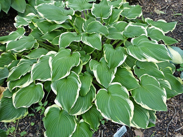 - Large mound of green foliage with wavy cream margins.